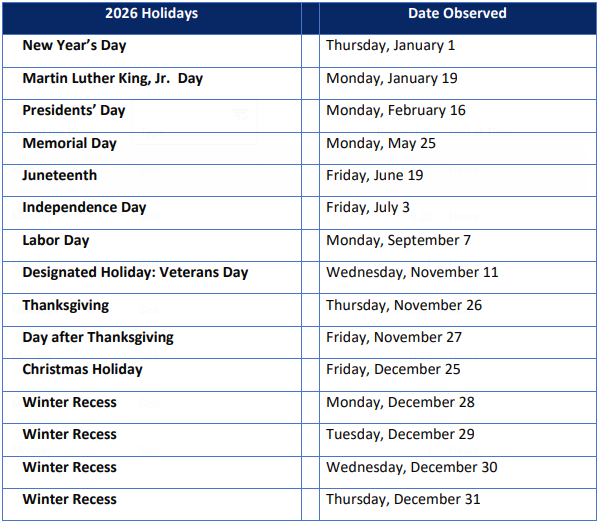Active full and part-time Staff and full-time Faculty receive a total of 11 paid holidays per year plus Winter Recess (the dates between Christmas and New Year's).
